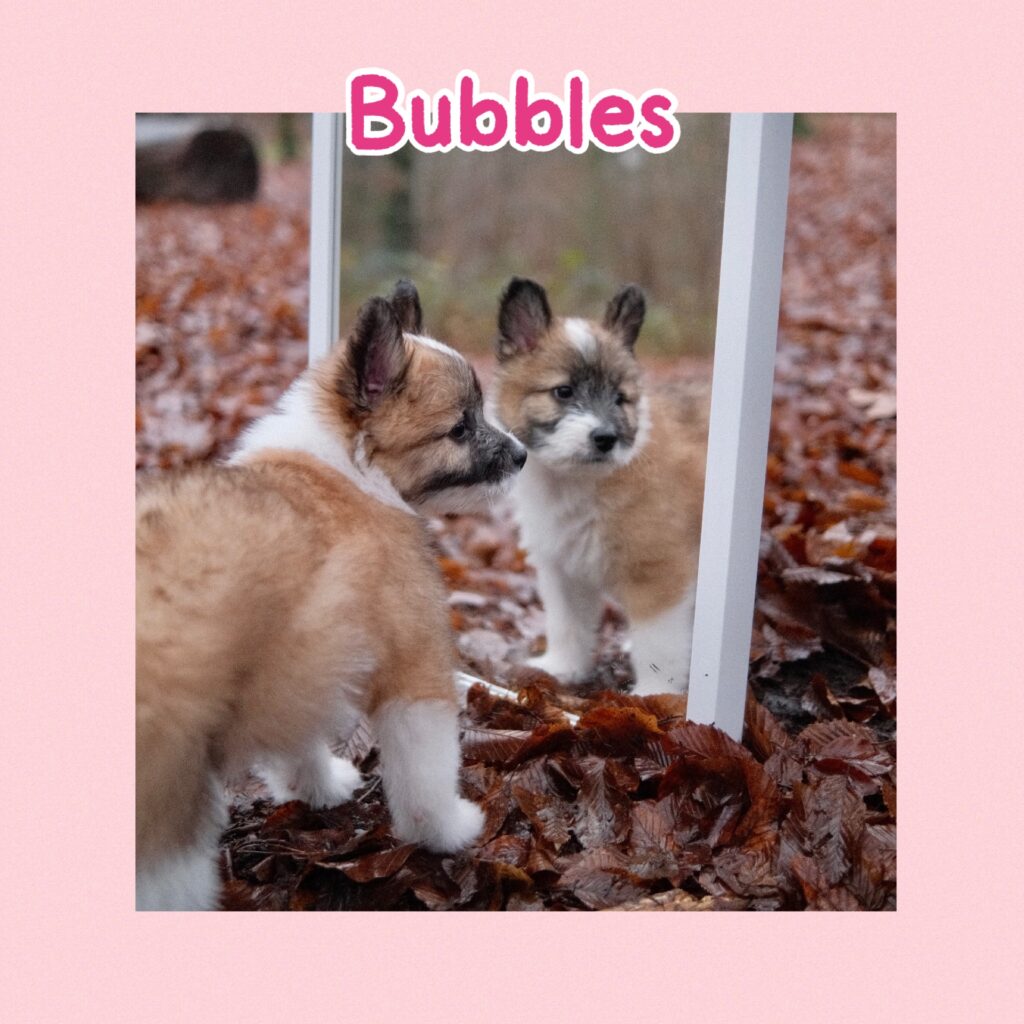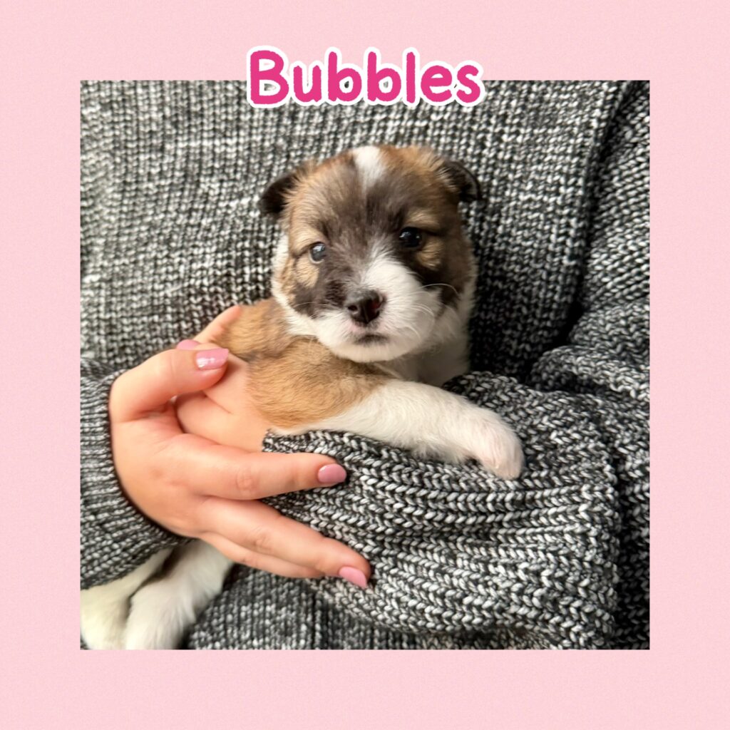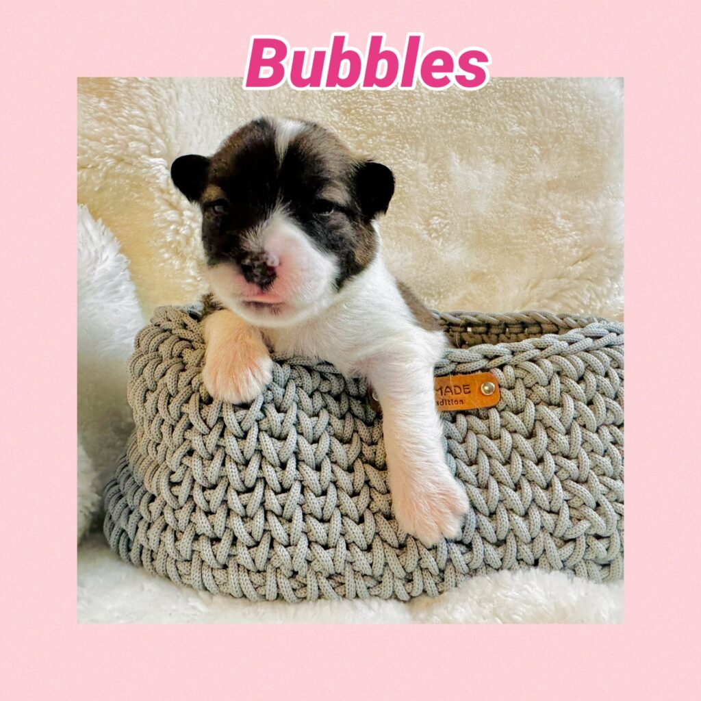 Bubbles 4 Wochen alt. Sie ist eine wuselige Hündin die ungern etwas verpasst. Sie ist total verschmust und genießt wenn sie Einzelkindzeit hat.