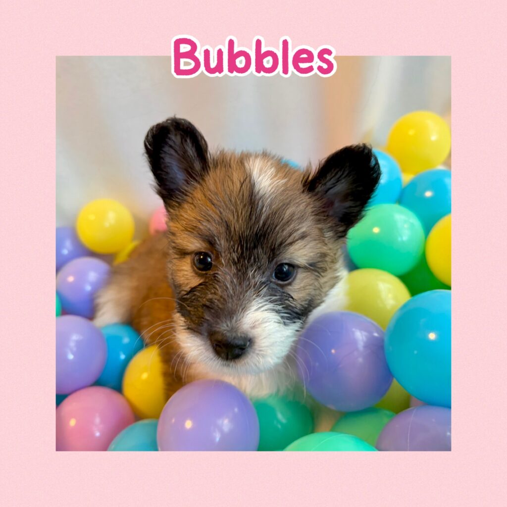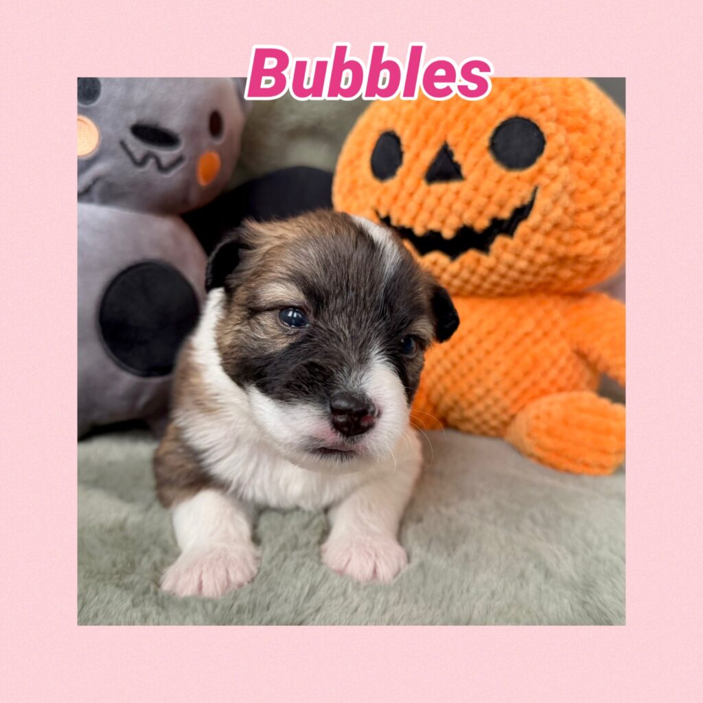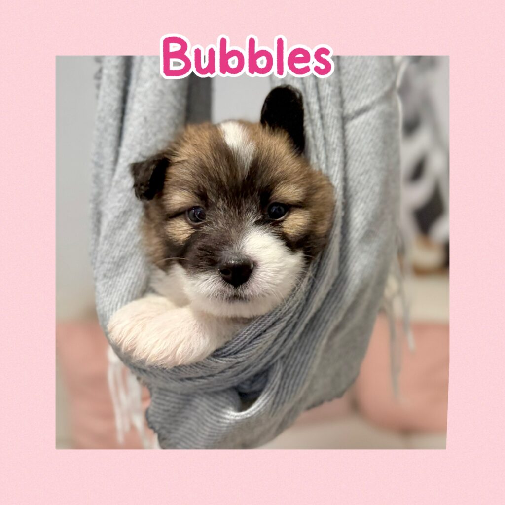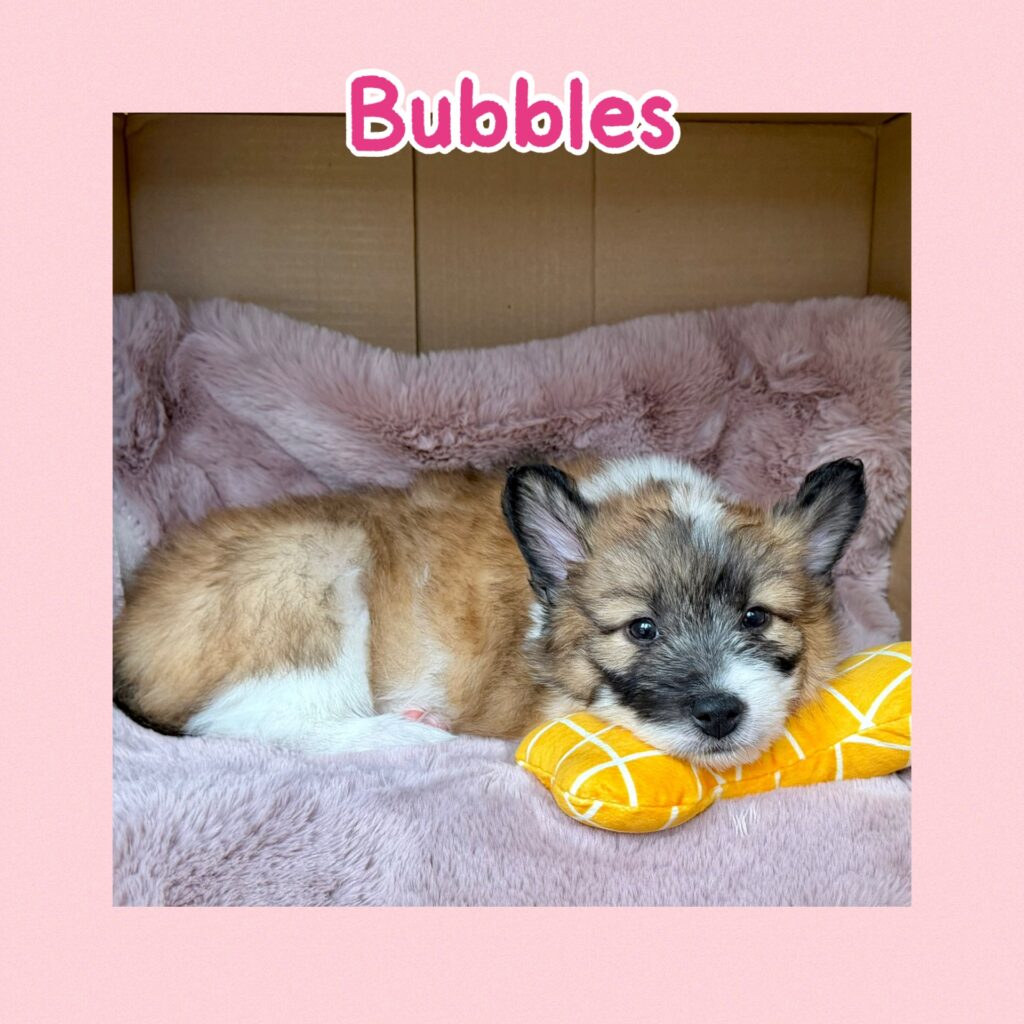 Bubbles 4 Wochen alt. Sie ist eine wuselige Hündin die ungern etwas verpasst. Sie ist total verschmust und genießt wenn sie Einzelkindzeit hat.